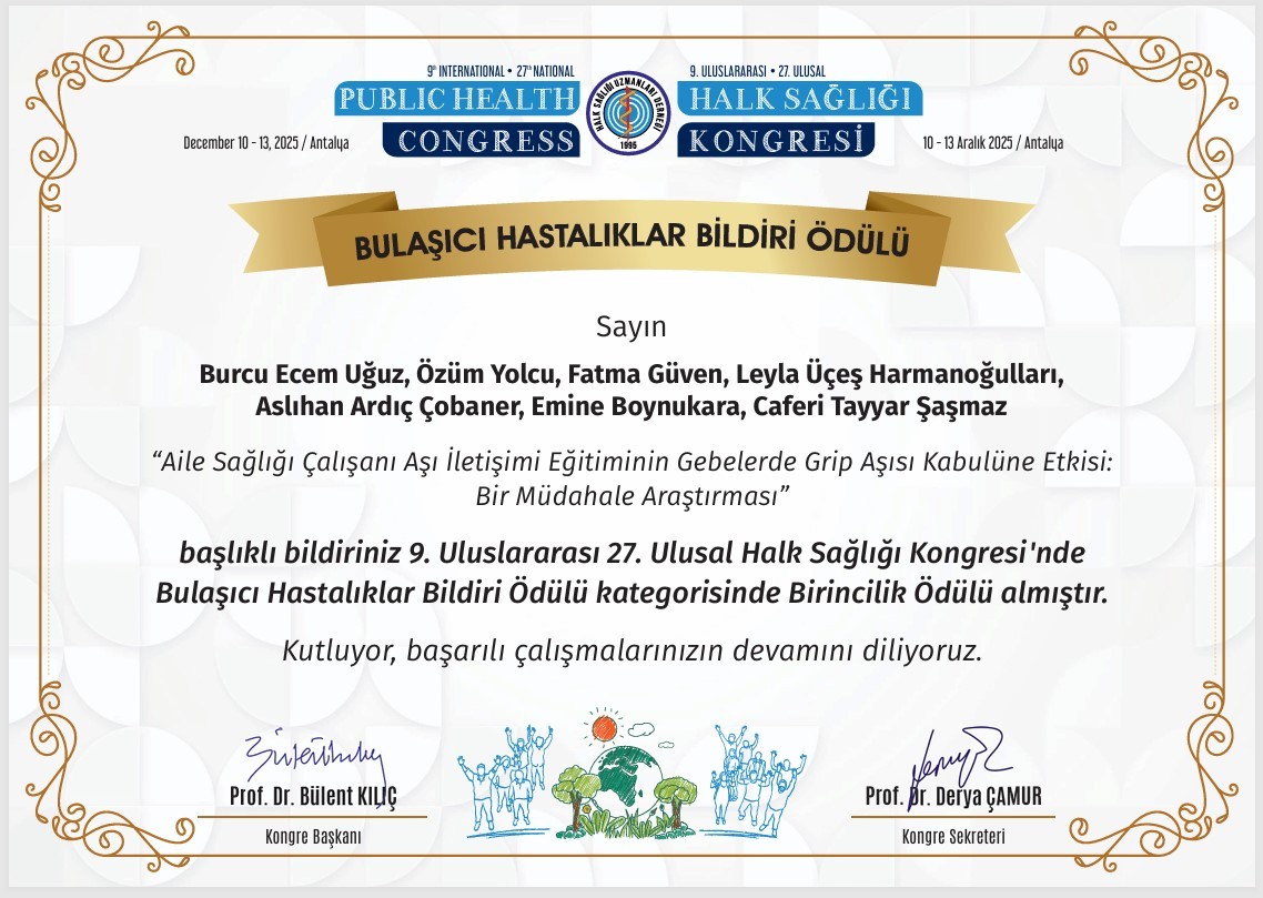 Sağlık Bilimleri Fakültesi Öğretim Üyemiz Prof. Dr. Gözde Gökçe İsbir ve Öğrencisi Dudu Naz Dur’a Sözel Bildiri Ödülü